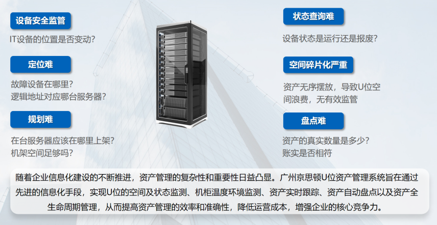 廣州斯必得U位資產管理系統通過先進的技術手段和管理理念,實現了對U位空間和狀態、機柜溫度環境、資產實時跟蹤、自動盤點以及全生命周期的全面管理。該系統的實施將有效提升企業的資產管理水平,降低運營成本,增強企業的競爭力。